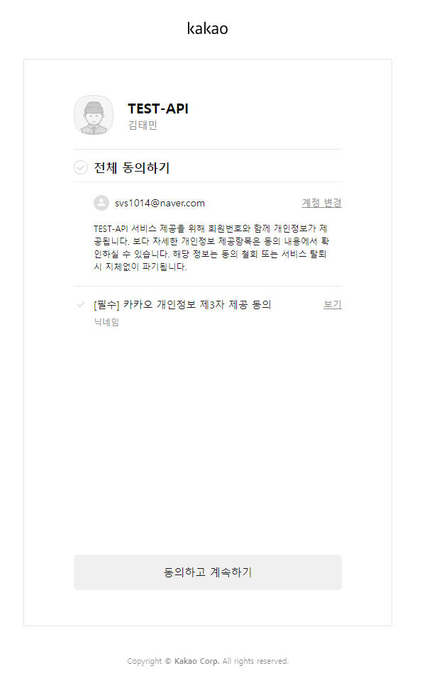동의하고 계속하기를 누르면 위 코드에서 redircetUrl로 '인가코드'값을 get방식으로 넘겨줍니다.